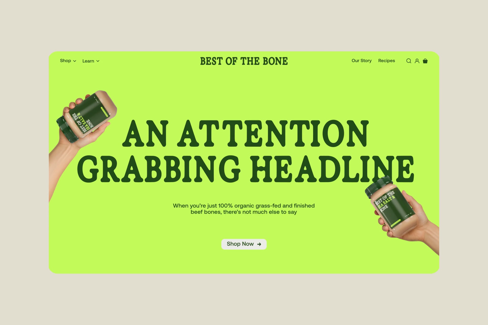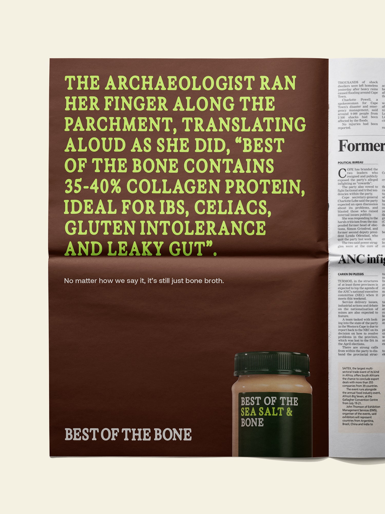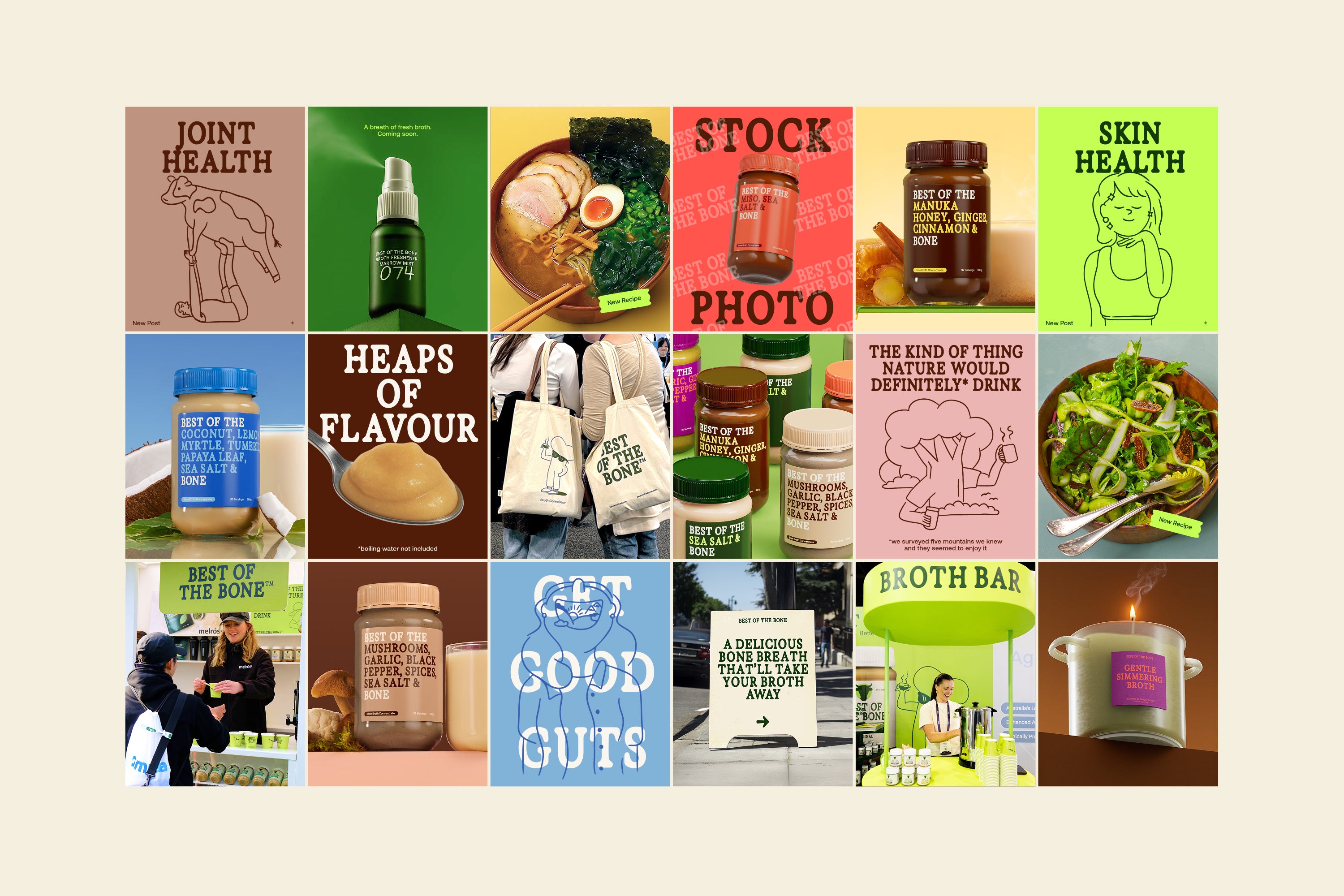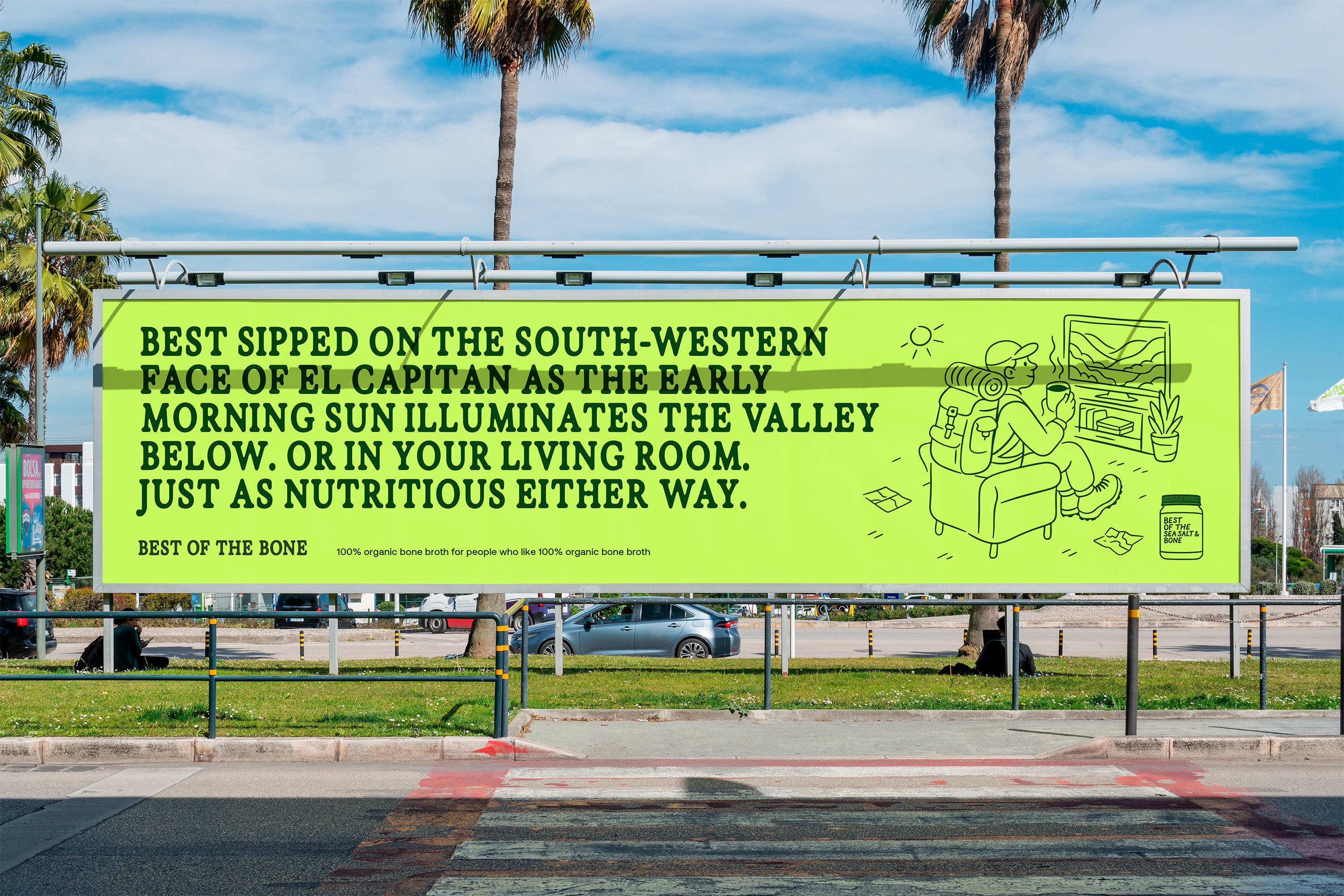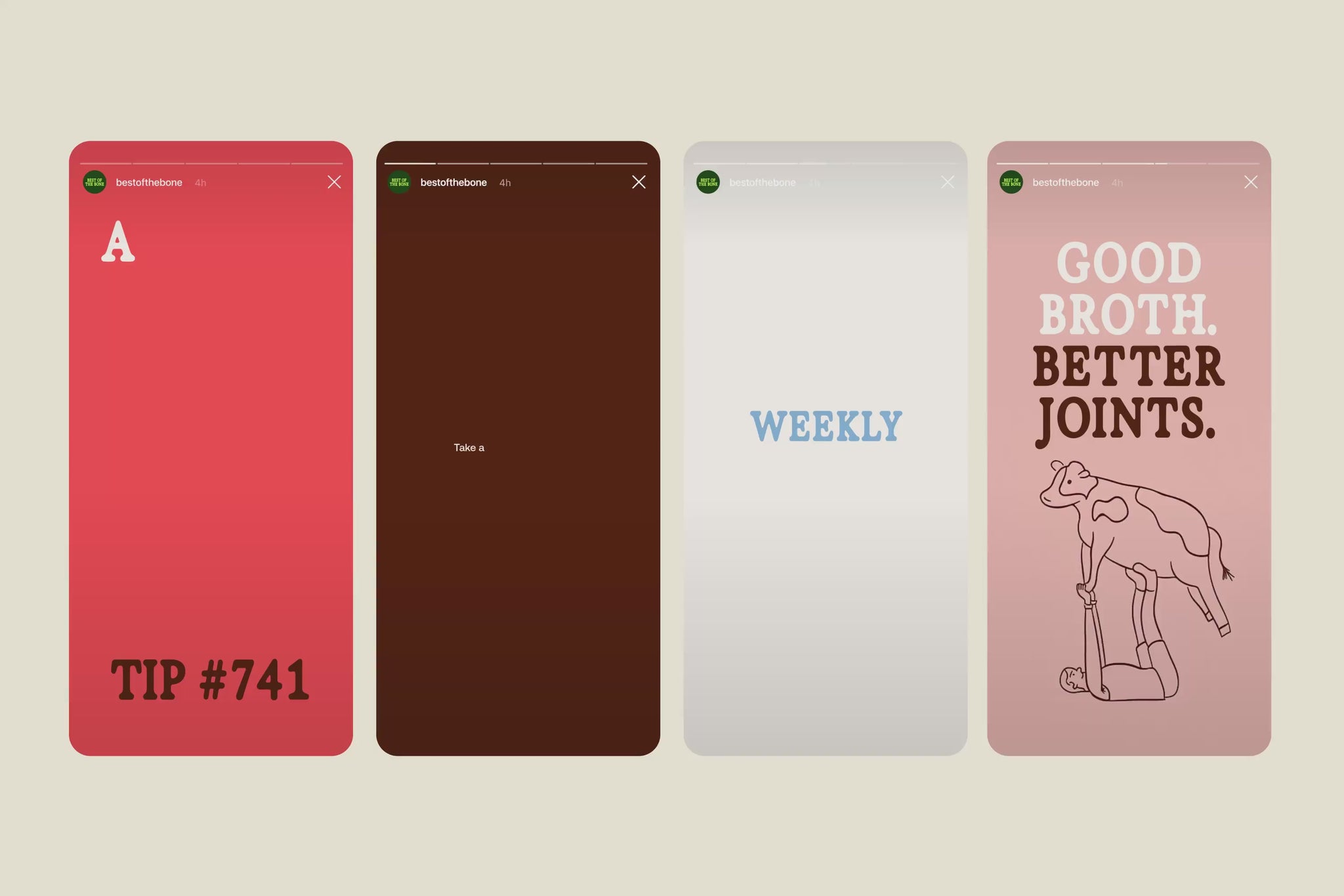 Best of the Bone makes bone broth. Not the miracle-elixir kind, or the drink-this-and-your-chakras-will-align kind, but the real-100%-organic-grass-fed-slow-simmered-and-genuinely-good-for-you kind. In evolving their brand, we took our cue from the product itself: unfussy, honest, and quietly full of goodness. We reduced everything down to its bare bones, embracing the blunt, matter-of-fact nature of bone broth while finding playful ways to amplify what’s inside. It’s a brand that knows bone broth might seem simple, but when you boil it all down, it’s anything but boring.